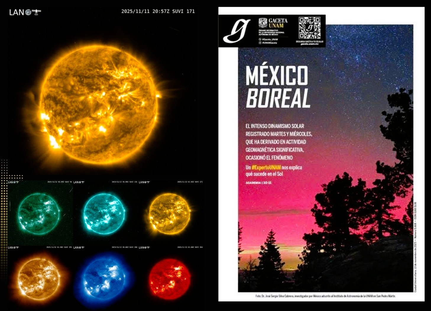 El Servicio de Clima Espacial México (SCIESMEX) del Instituto de Geofísica de la UNAM, ha notificado que en los últimos días el Sol ha generado alta actividad, con fulguraciones que han alcanzado incluso la clase X5, así como EMC en dirección hacia la Tierra (DGCS, 2025).